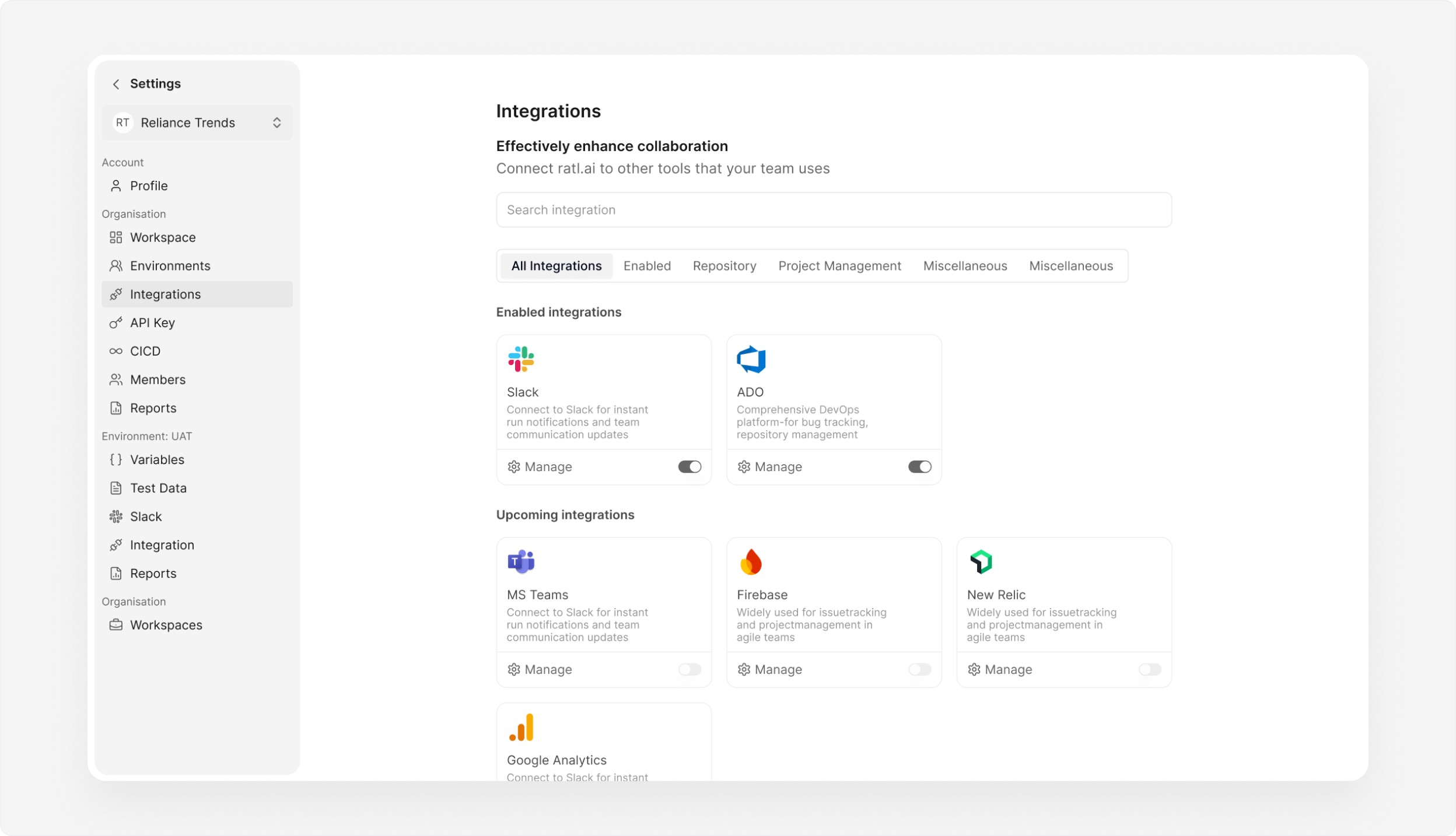 Teams begin by feeding ratl.ai their API surfaces (OpenAPI, collections, or direct request definitions) and connecting existing SDLC tools. The system assesses context and readiness.